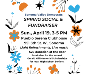 Funds for the Gerald Hill Memorial Scholarships will be raised at the upcoming Dems Spring Social and everyone is invited. Elected officials and candidates have also been invited. It will be on Sunday, April 19, 3 – 5 PM Pueblo Serena Club House, 951 5 Dt. West, Sonoma. A $20 donation per person will be requested at the door. For more information or questions, please email contact@svdems.org