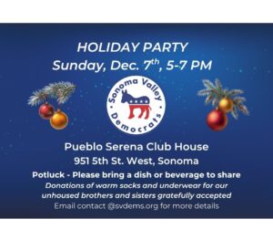 The Sonoma Valley Democrats Holiday Party will be on Sun., Dec. 7th, 5-7 PM at the Pueblo Serena Club House in Sonoma. Please bring a potluck dish or beverage to share. We are collecting new warm socks and underwear for the unhoused in Sonoma. For details email contact@svdems.org