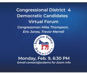 Everyone is invited to bring their questions for the Democratic Candidates for Congressional District 4 to a virtual Forum hosted by the Sonoma Valley Democrats on Monday, Feb. 9, at 6:30 PM via Zoom. Congressman Mike Thompson, Eric Jones, and Tervor Merrill have all confirmed their attendance. For Zoom link email: contact@svdems.org